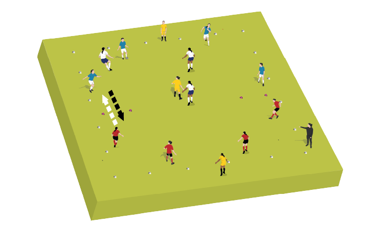 4. Progress the practice by allowing players to dribble through the gates as well as pass through. Encourage movement to keep equal numbers on each side of the playing area.