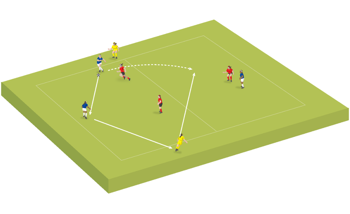 Playing in a slow tempo, the attacking players aim to switch play in the other half of the pitch. After four passes, they can switch play. When the ball is switched across, one attacker and one defender move across as well to create a 2v2(+2) in the other half and the practice continues.