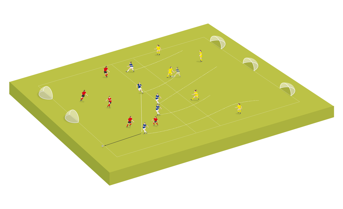 If the Blues regain possession or the ball goes out of play, the game restarts in the small square with a 3v1 (rotate defending player).